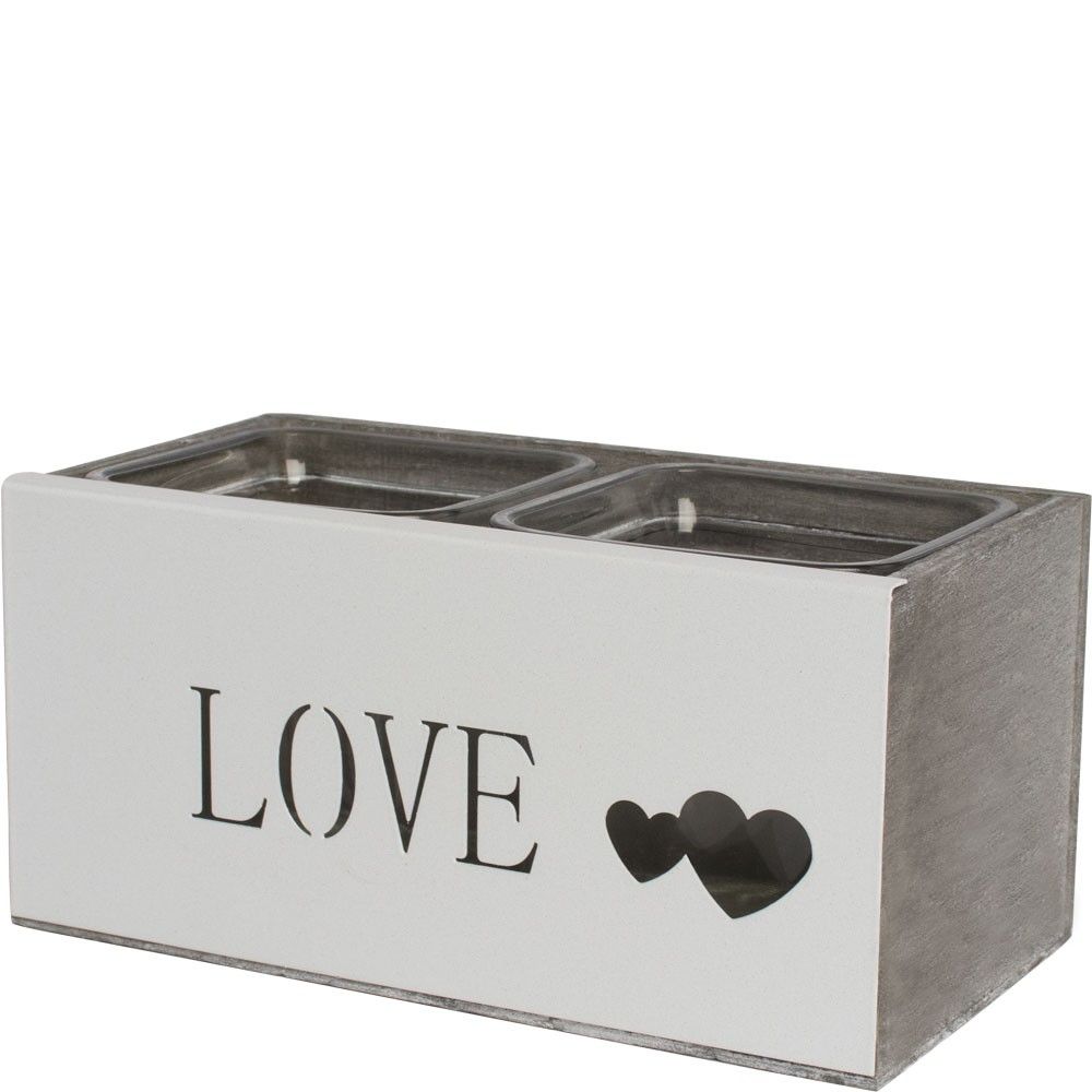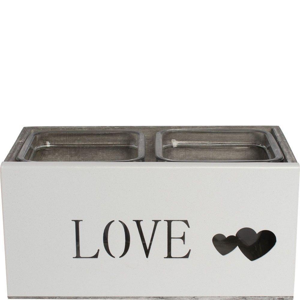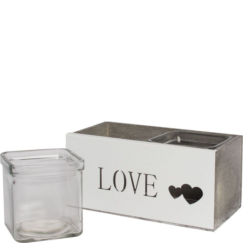 This charming set includes two clear glass cube vases, beautifully encased in a grey wash wooden box with a white metal front.
