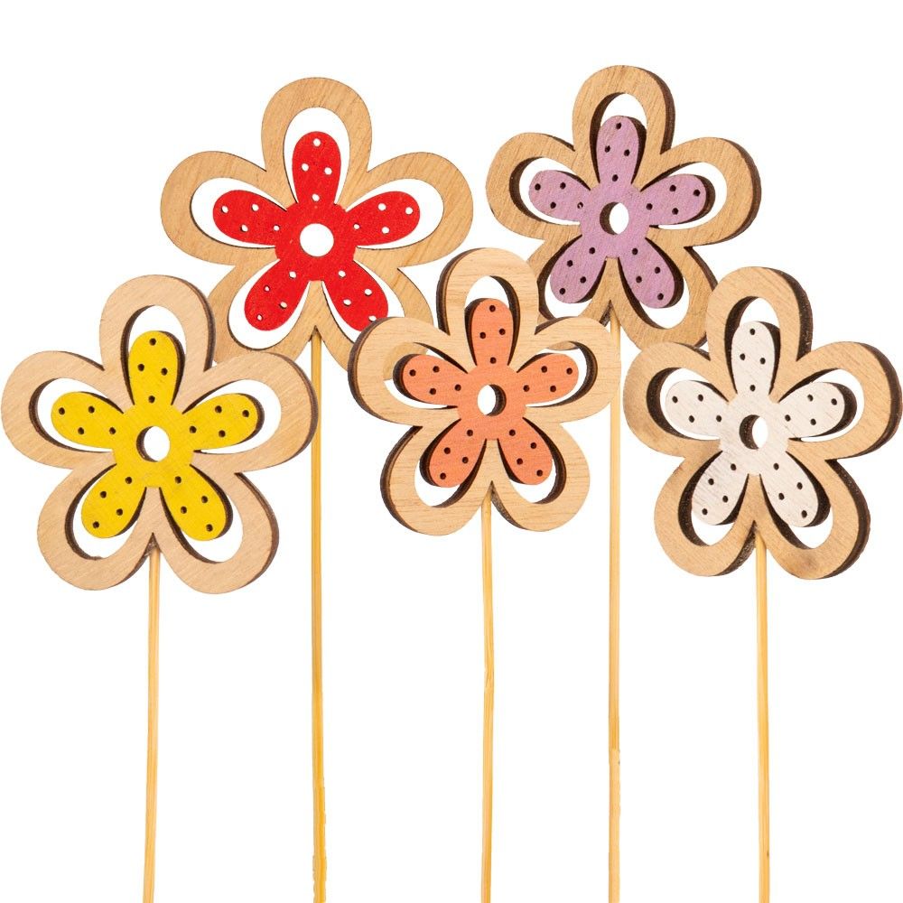 Each pack includes 10 laser cut wooden flowers in soft shades of yellow, white, lilac, peach, and red, with two of each colour. Mounted on short wooden picks, these delicate floral accents are perfect for bouquets, centerpieces, gift wrapping, and DIY projects.