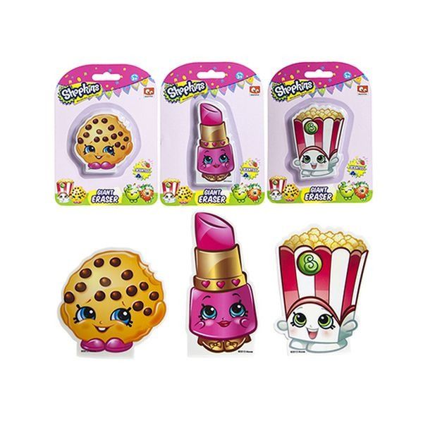 Click here to visit the Shopkins official Website Packaging: Blister Carded. Barcode (EAN): 5050565258496 Single. Shopkins. Jumbo Eraser. 3 Assorted Designs: Kooky Cookie, Poppy Corn and. Lippy Lips