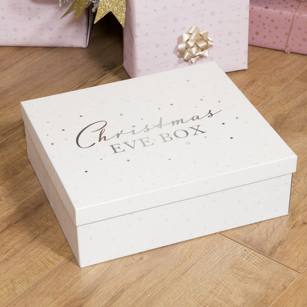 Keep your memories or gifts in this delightful large Christmas Eve box from Bambino. Finished in soothing, crisp white with silver foiled lettering and golden stars.