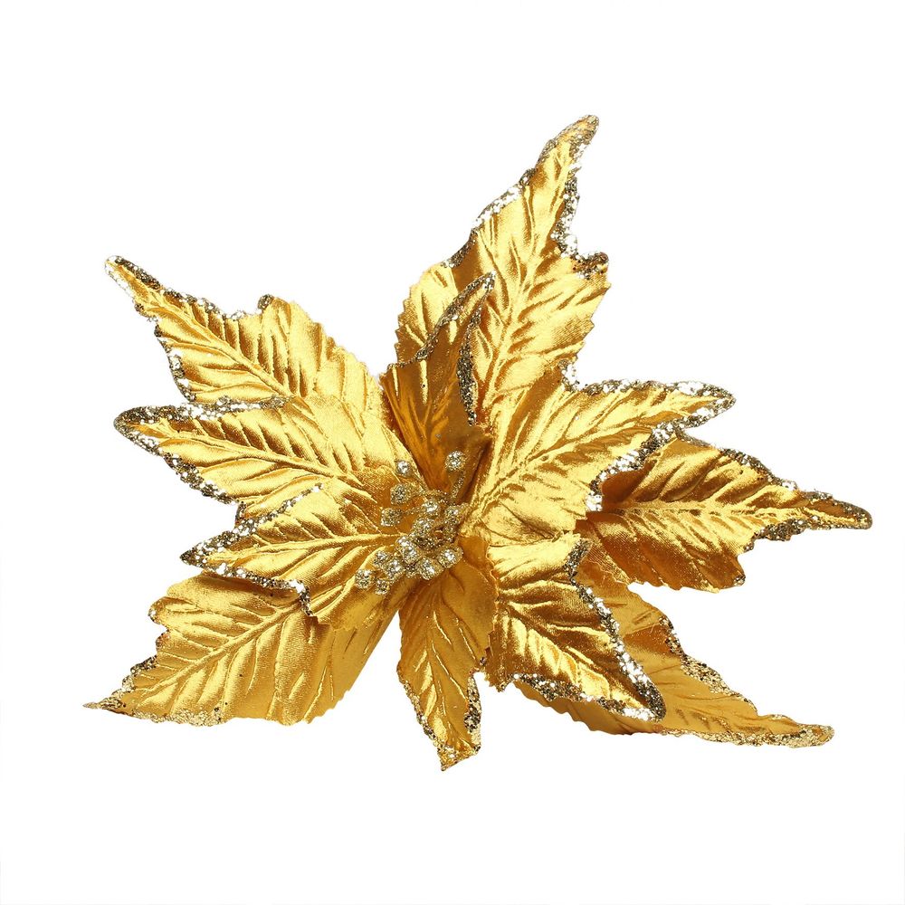 This large poinsettia pick has a lustrous gold finish making it perfect for a dramatic Christmas display.