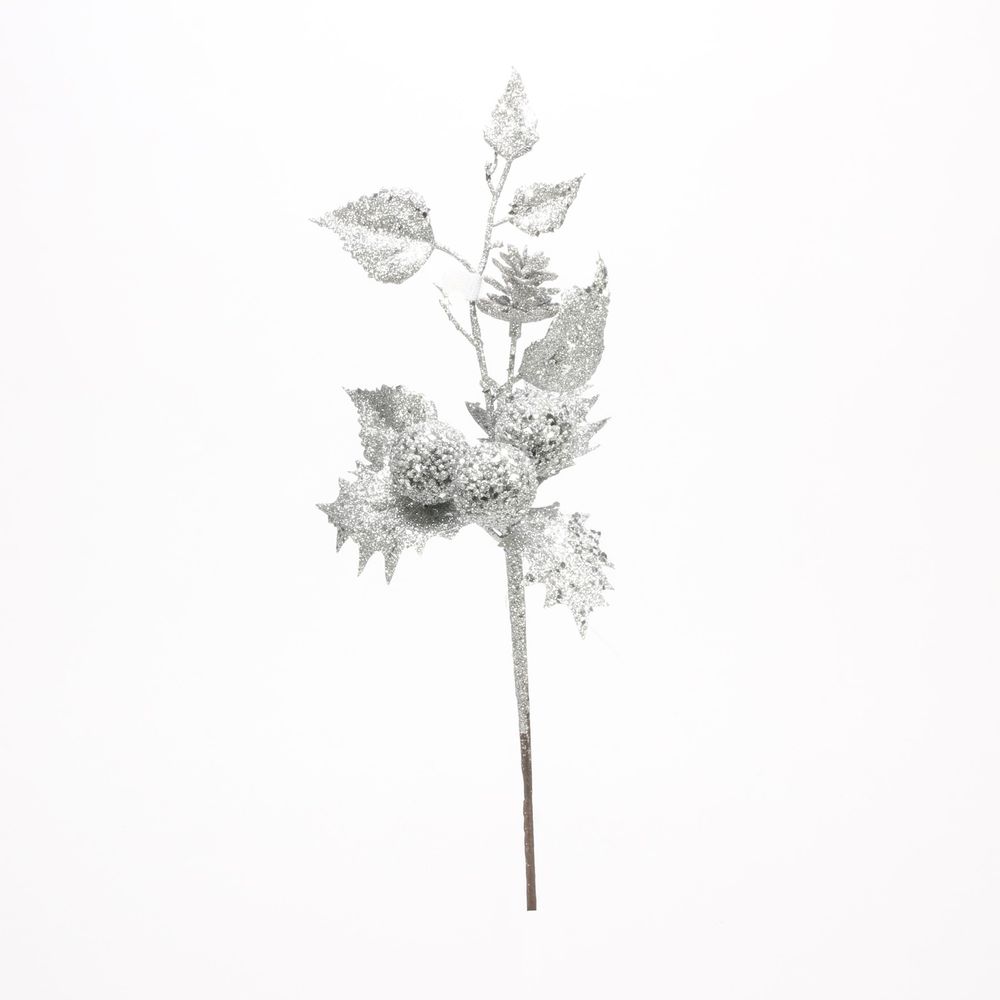 Silver Glittered Holly Spray (38cm)