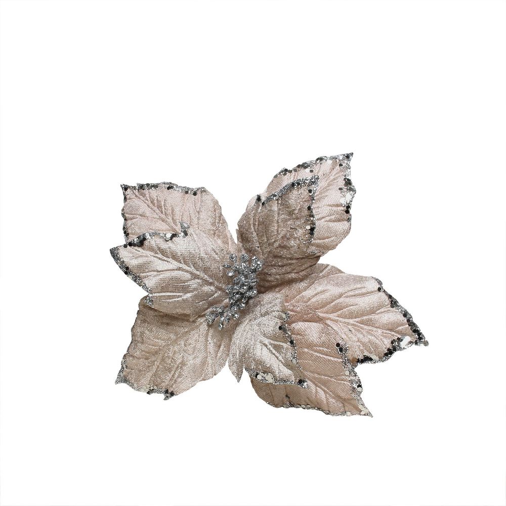 This small poinsettia pick features matte petals with a glitter decal outline, making it perfect for a dramatic Christmas display.