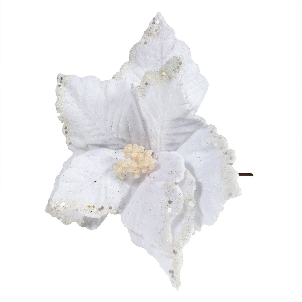 This velvet poinsettia is the ideal addition to your festive displays! The edges are covered in glitter adding a sparkle to the product.