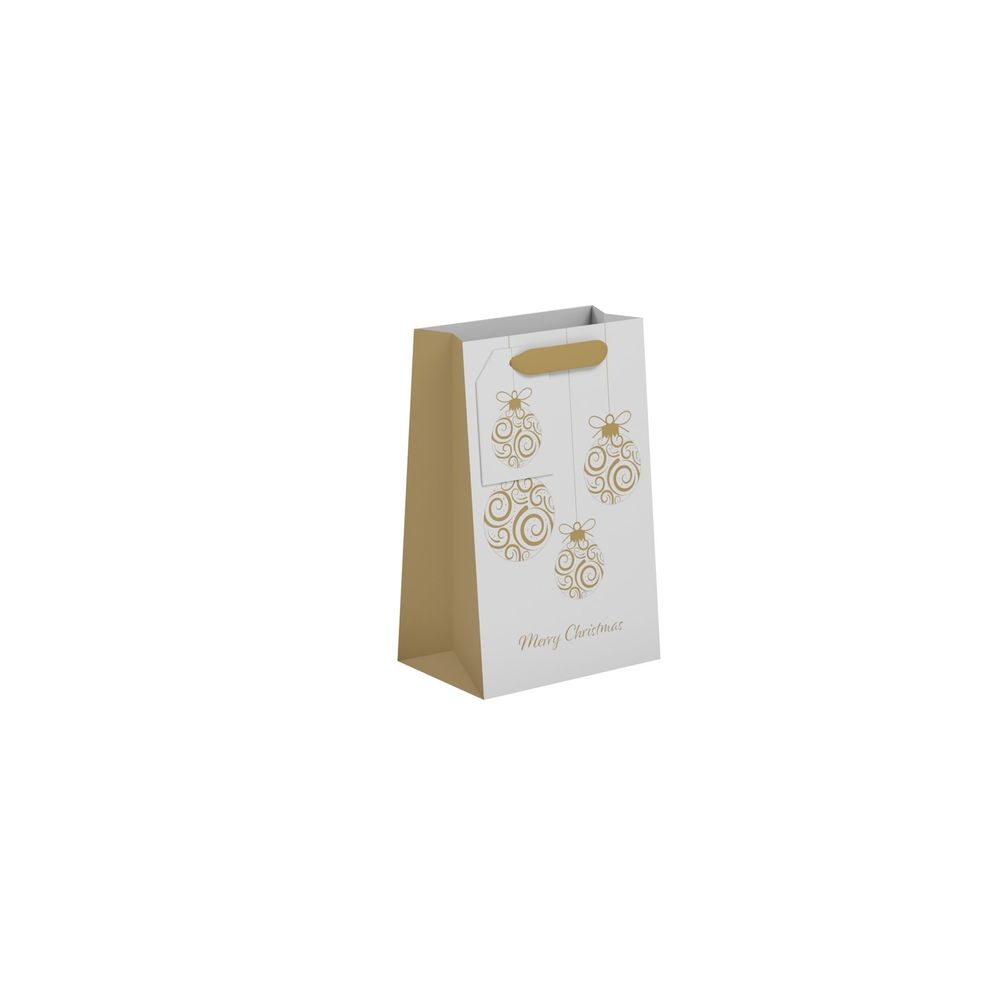 This gift bag features a white background with a gold bauble design and contrasting gold sides.