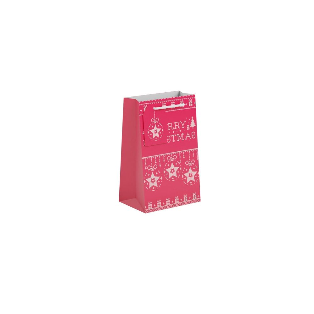 This gift bag features a red background and embroidered-style 'Merry Christmas' bauble design, perfect for creating festive cheer when gift-giving this Christmas.