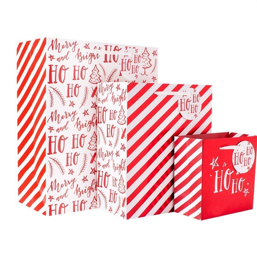 Place your special gifts in these festive red bags with a decorative ho ho ho design.