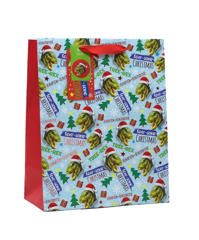 Package your Christmas gifts in this cool altnerative dinosaur gift bag. This gift bag features a festive dinosaur design, perfect for dinosaur lovers!