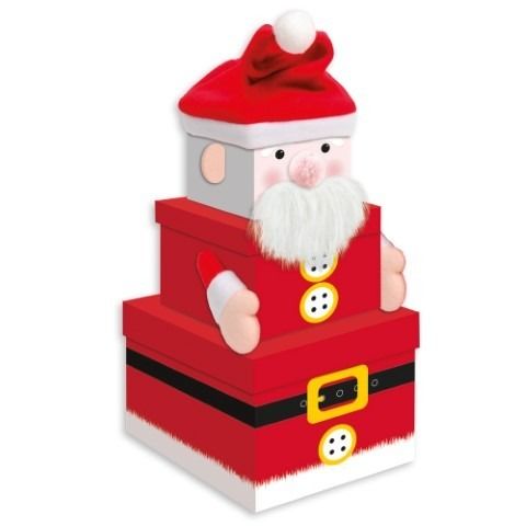 Add an extra layer to your gift wrapping this year with these adorable stacking boxes. Featuring Santa with gold accessories, hat and beard.