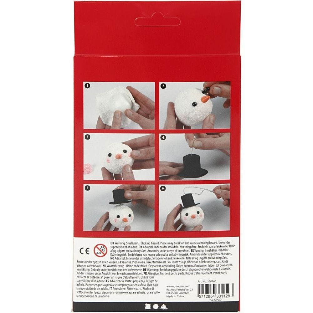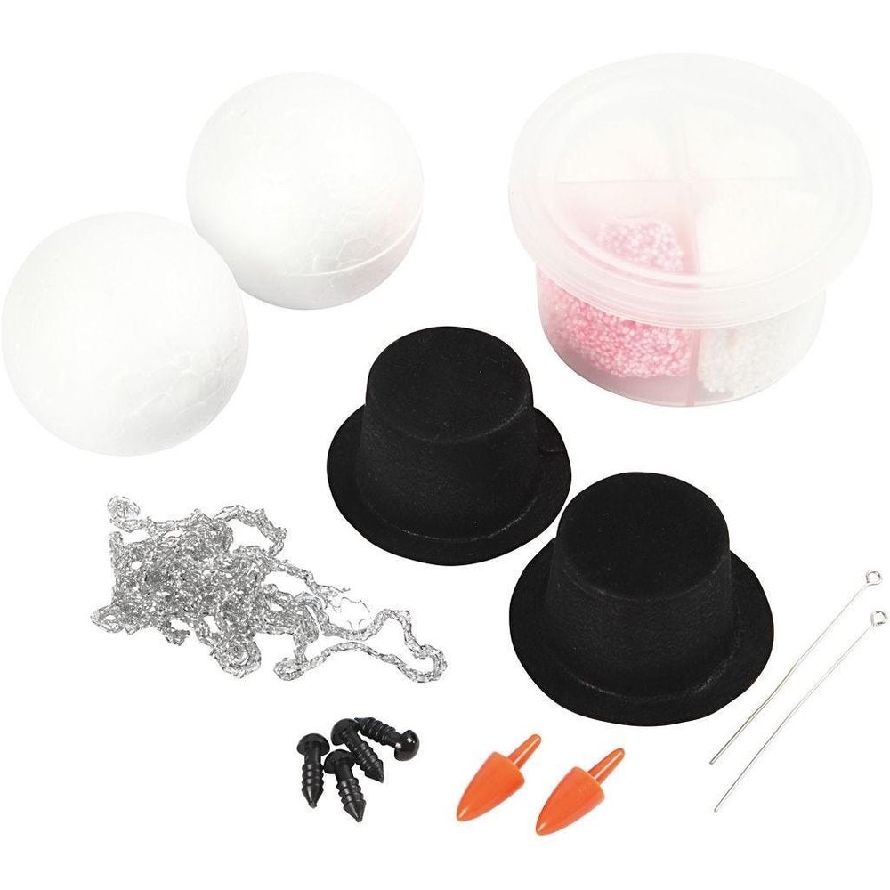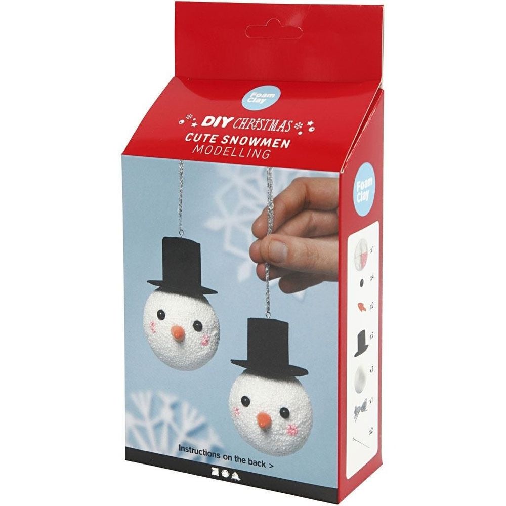 Create your own snowman with our mini creative kit. Includes: foam Clay in two colours with glitter, polystyrene balls, eyes, nose, hats and string for suspension.