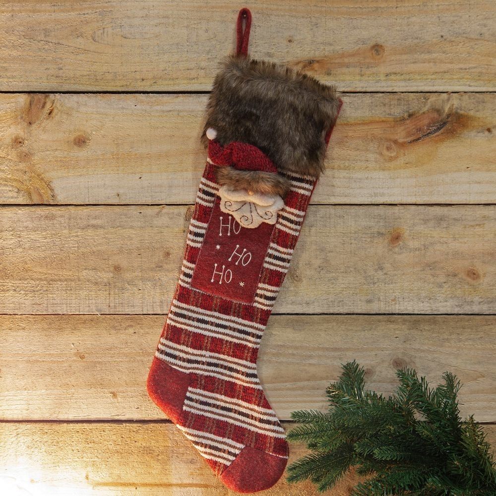 These charming stockings are handmade from red and white striped fabric with brown faux fur trim.