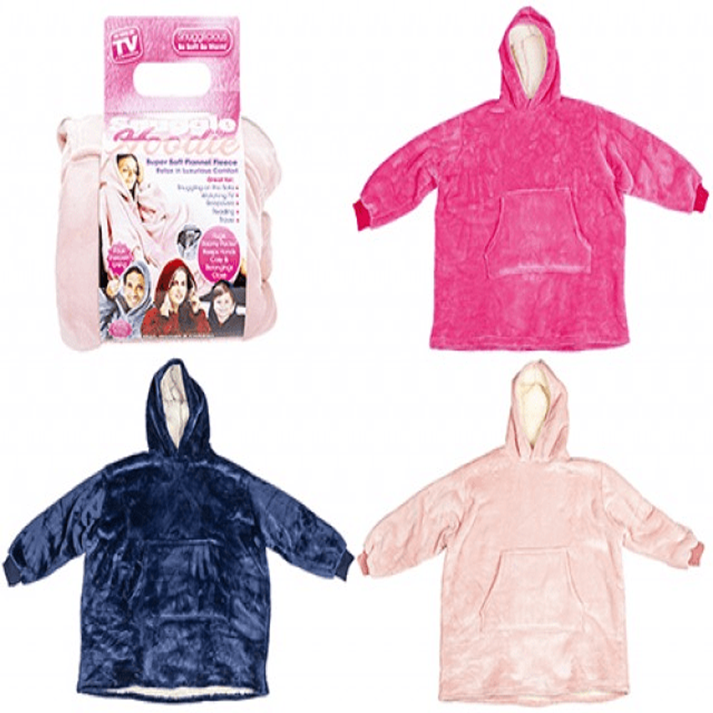 A large super soft snuggle fleece hoodie in 3 assorted colours: light pink, hot pink & dark blue.