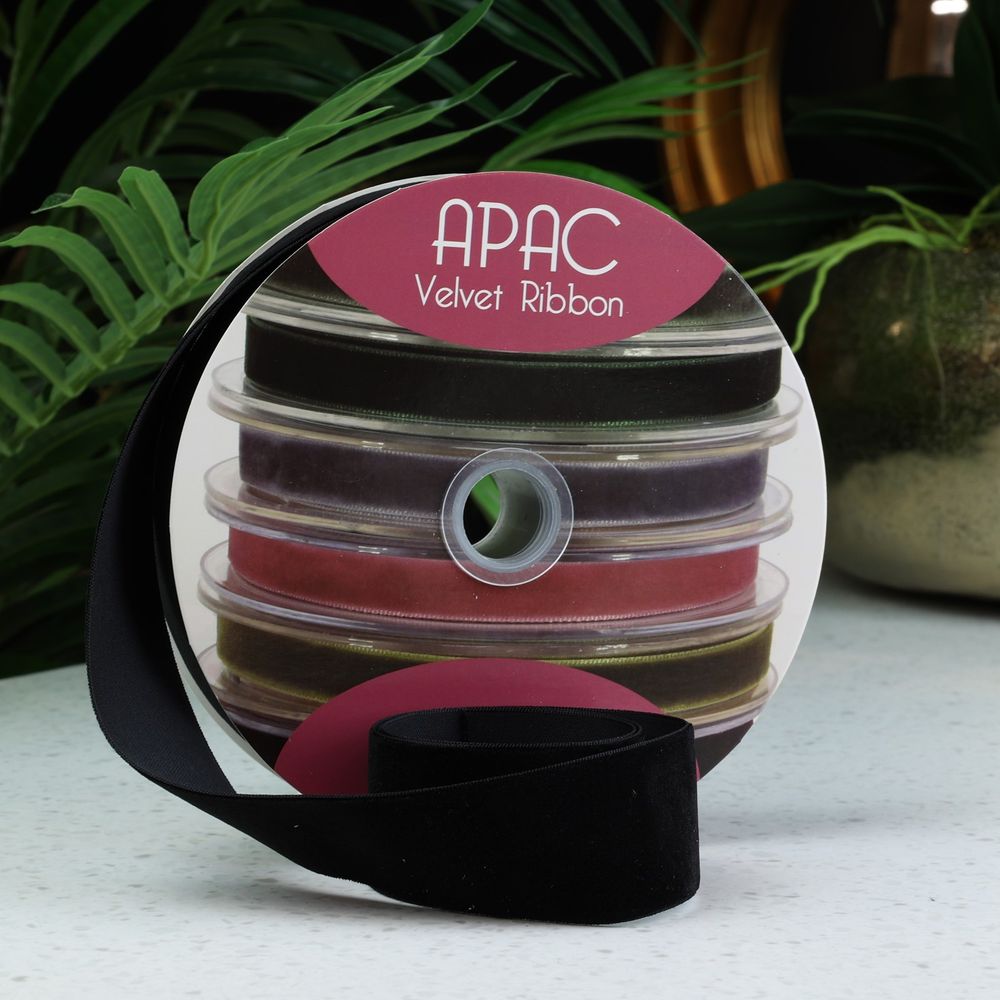 A beautiful velvet ribbon, a soft weave with a mat finish made from nylon or polyester. This versatile product is perfect for trimming gifts, church pews or bouquets.