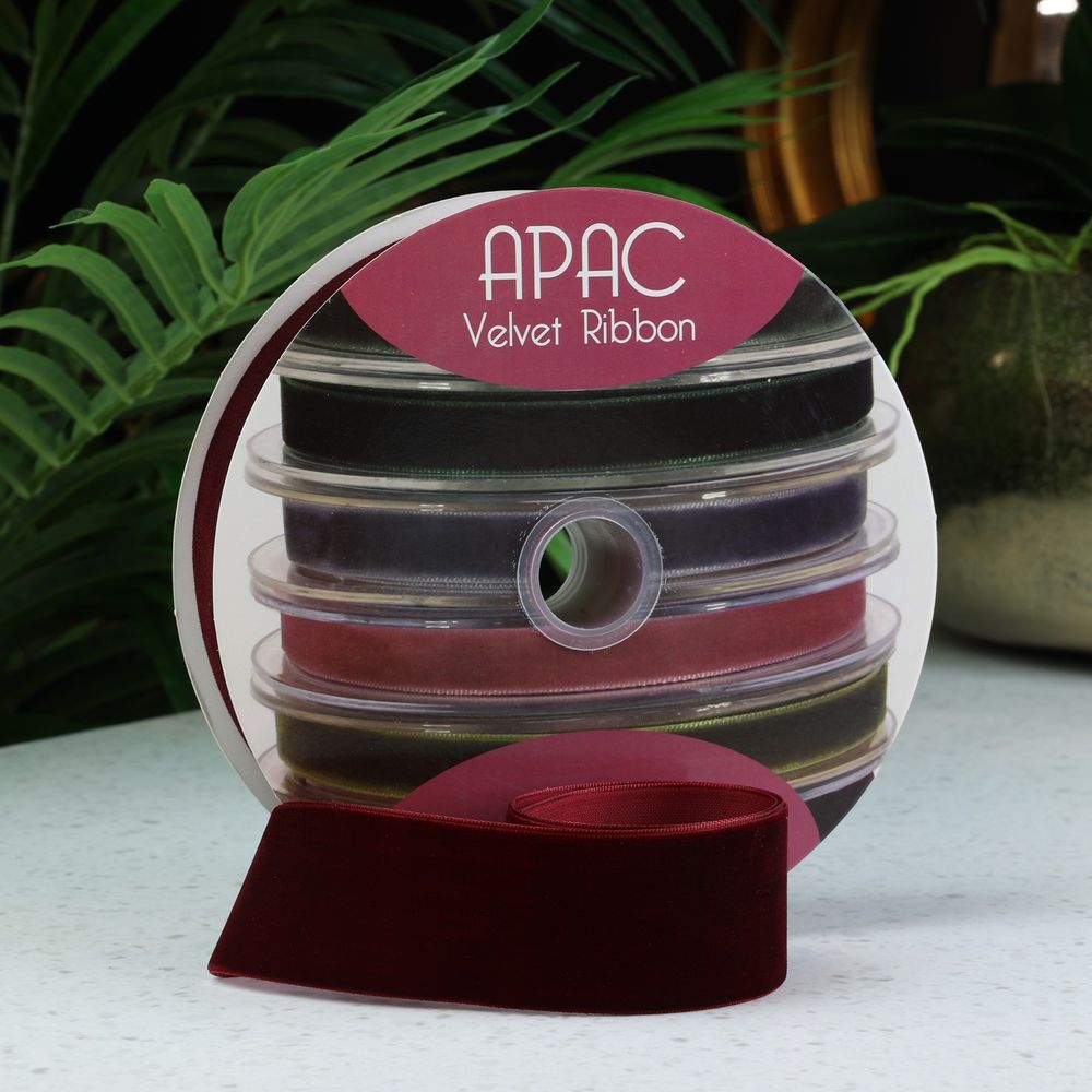 A beautiful velvet ribbon, a soft weave with a mat finish made from nylon or polyester. This versatile product is perfect for trimming gifts, church pews or bouquets.