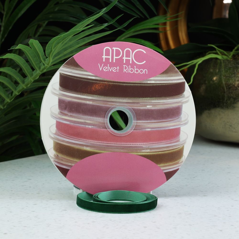 A beautiful velvet ribbon, a soft weave with a mat finish made from nylon or polyester. This versatile product is perfect for trimming gifts, church pews or bouquets.