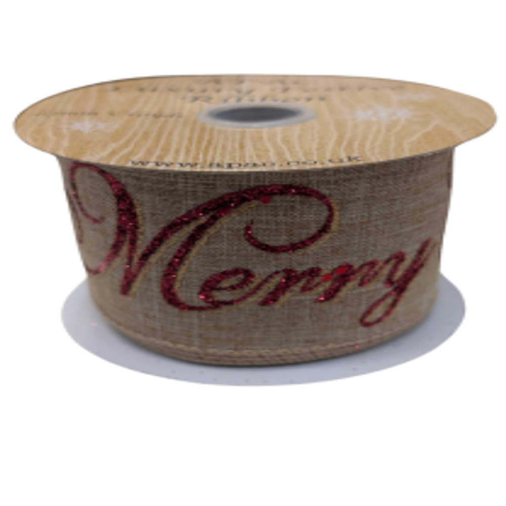 Natural with red glitter Merry Christmas Ribbon 63mm