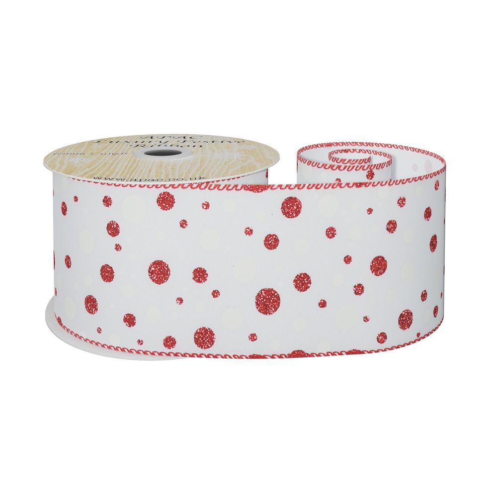This ribbon has been specially designed to amplify the festive spirit in any home. The combination of sleek white material and red and white glitter dots will add the perfect touch to your beloved decorations. It's 63mm width is sure to make a statement, while the 10 yards length gives you plenty of ribbon for gift-wrapping, crafting, or adding a much-needed finishing touch to decorations.