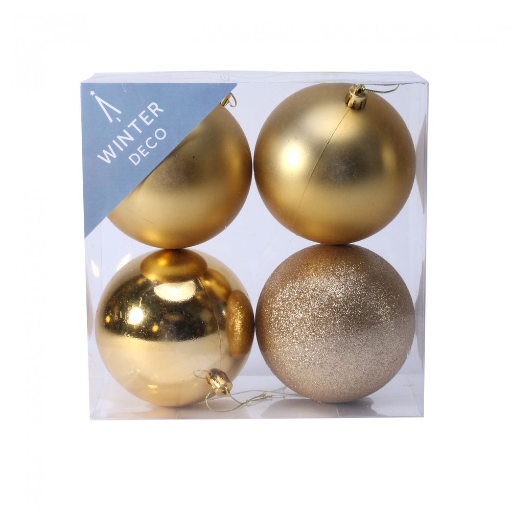 This set of 4 Gold Shatterproof Baubles would be a great addition to your tree. The set includes matte, metallic and glitter finishes.