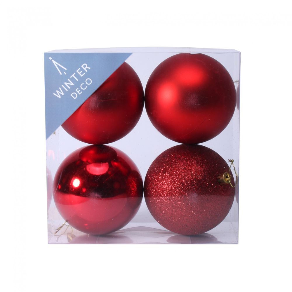 This set of 4 Red Shatterproof Baubles would be a great addition to your tree. The set includes matte, metallic and glitter finishes.