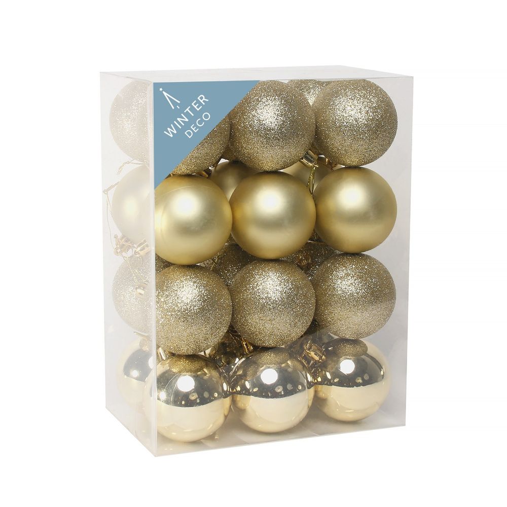 This set of 24 Champagne Shatterproof Baubles would be a great addition to your tree. The set includes matte, metallic and glitter finishes.