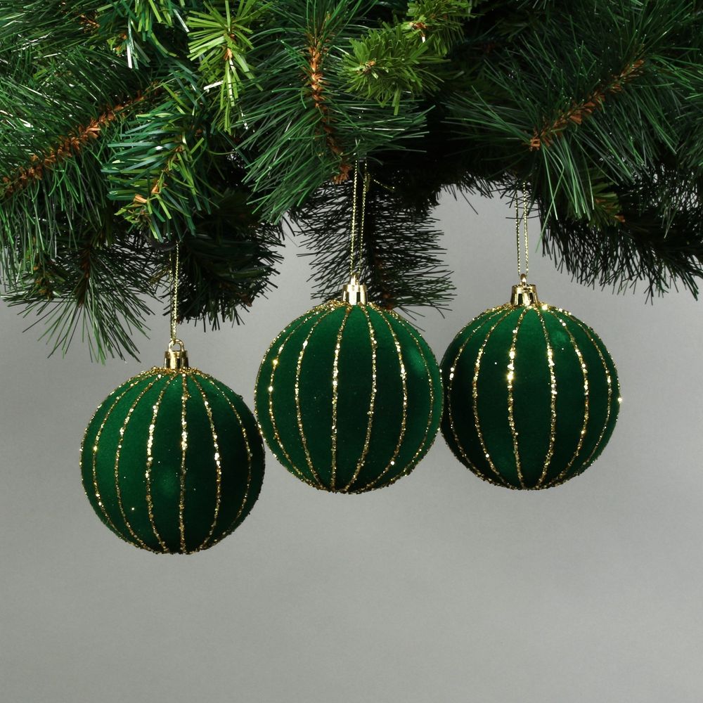 8cm Green Velvet Baubles with Glitter Trim (Set of 6)