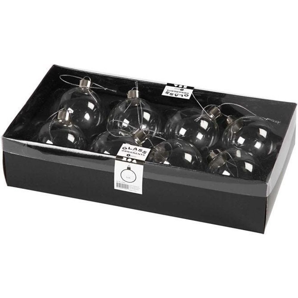 Fine ornaments of clear glass with a metal hanger. 6 ornaments supplied in a gift box with a transparent lid. Ornaments should not be cured in an oven.