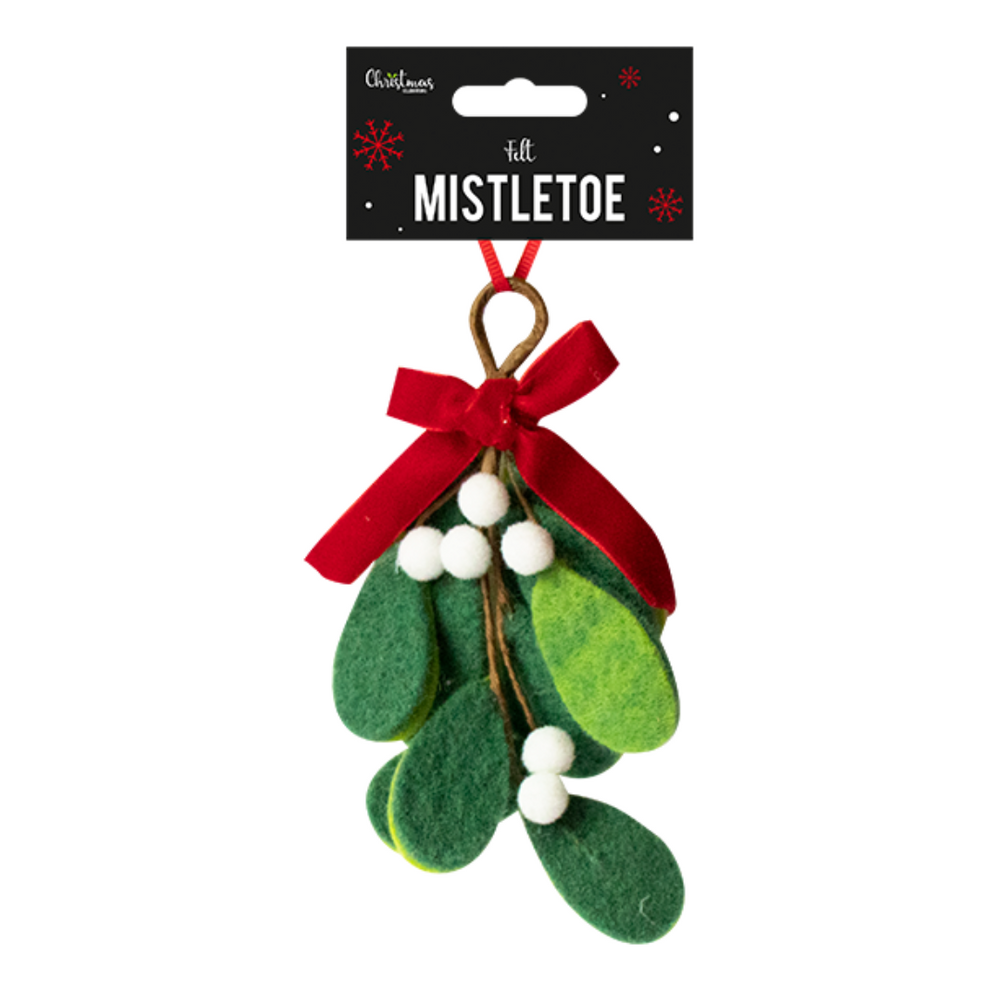 Experience the traditional charm of Christmas with our beautiful Mistletoe Felt Decoration. Our decoration includes a green felt base and bright white pom-pom elements for a realistic representation of the plant. The piece is completed with a red ribbon for easy hanging. Make this festive addition to your celebrations today!