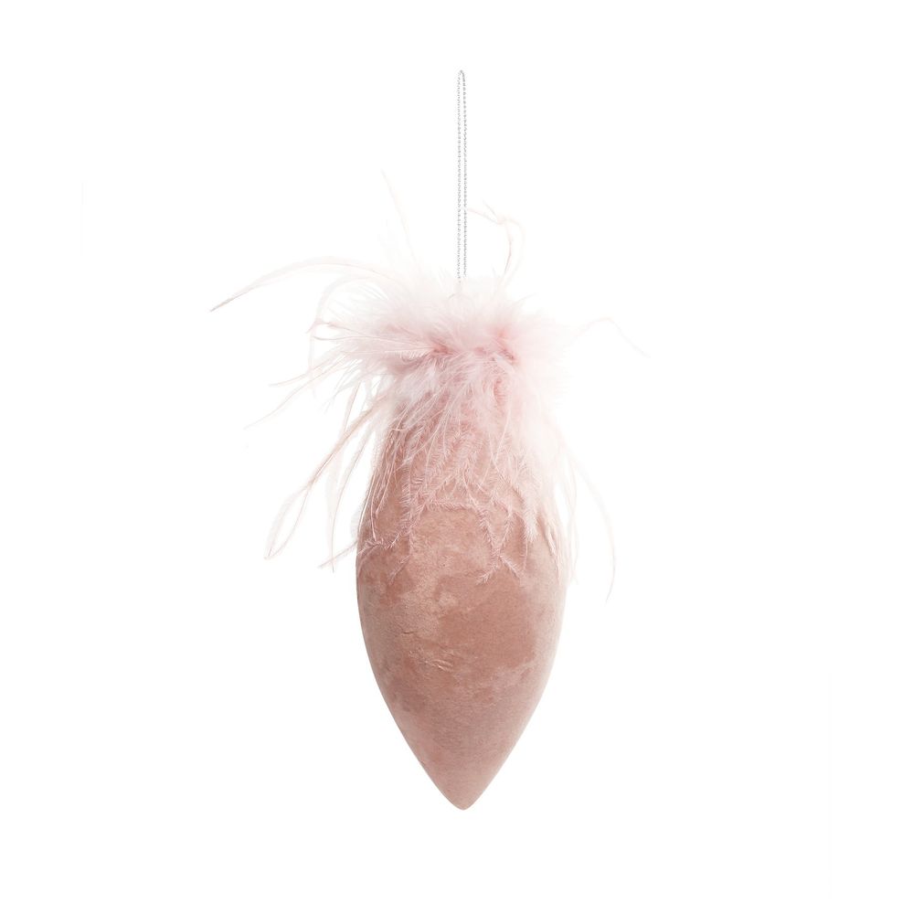 Pink Velvet Glass Droplet Bauble with Feather (H16cm)