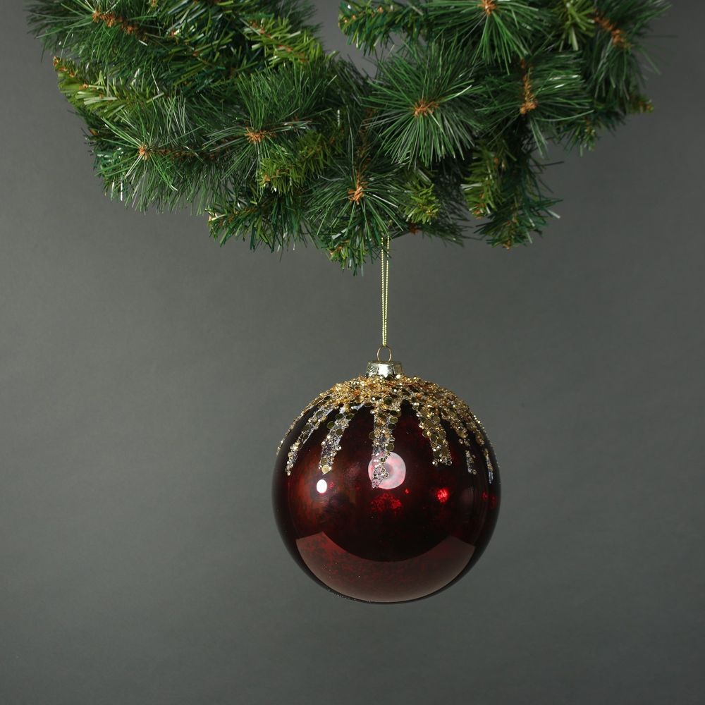 This pretty onion glass bauble features a lustrous red surface complimented by a contrasting gold glitter drip-effect.