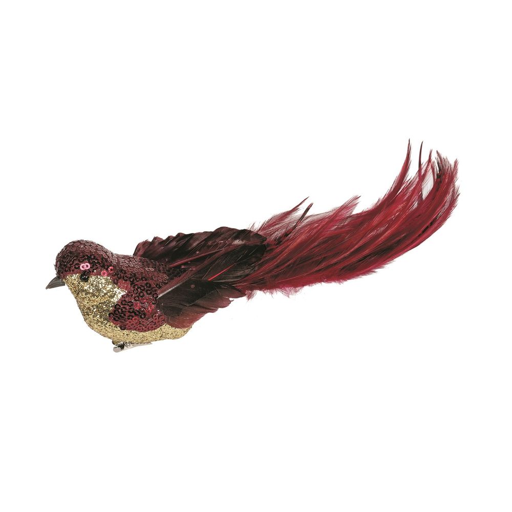 Burgundy Sequin & Glitter Feather Bird with Clip L29cm