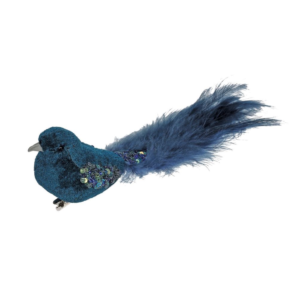 Peacock Blue Velvet Bird with Glitter and Clip (20cm)
