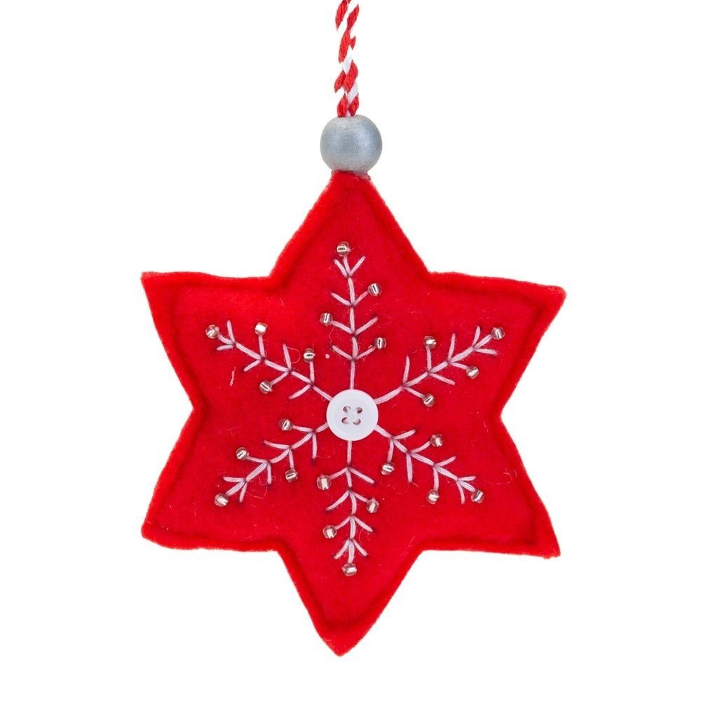 With a minimalist feel, this felt star features delicate snowflake embroidery with a small button and candy-cane string hanger finished off with a wooden bead.