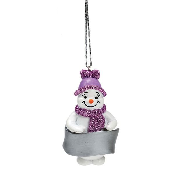 Snowgirl White Resin Ornament With Lilac Glittered Scarf & Hat. Can be personalised using a Sharpie pen.