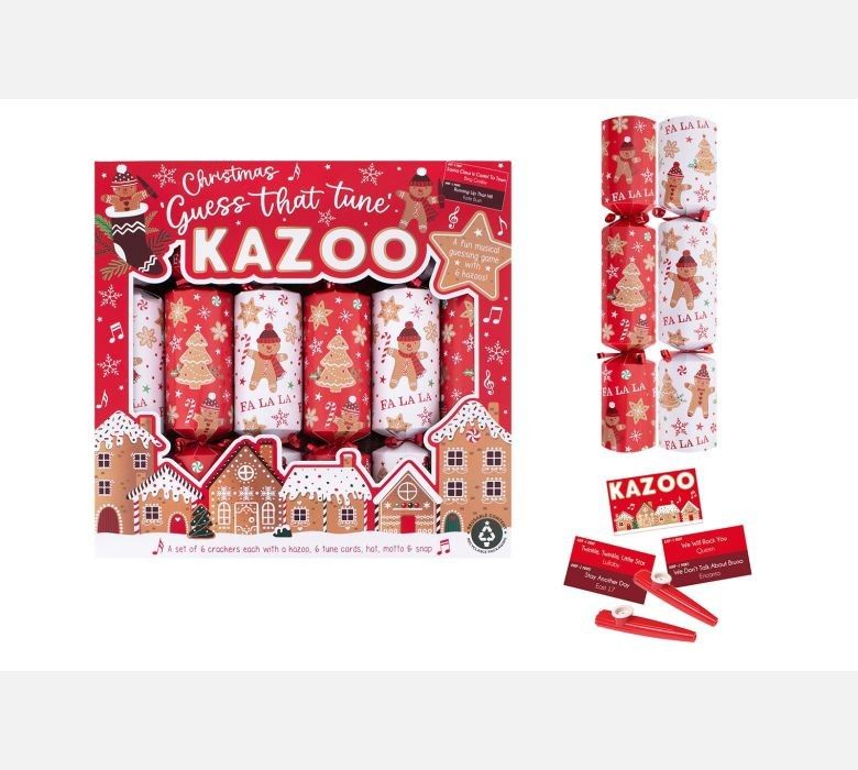 This box of six crackers is a fun and engaging item for any seasonal collection, featuring a decorative box, with interactive gaming contents. Each gingerbread design cracker contains a hat, motto, snap and a musical kazoo game.