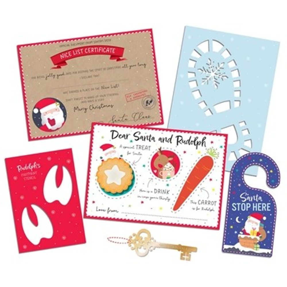Each set includes a treats mat for Santa and Rudolph, a “Santa Stop Here” hook, footprint stencils to leave behind magical tracks, an official “Nice List” certificate, and a golden Santa key for homes without chimneys.