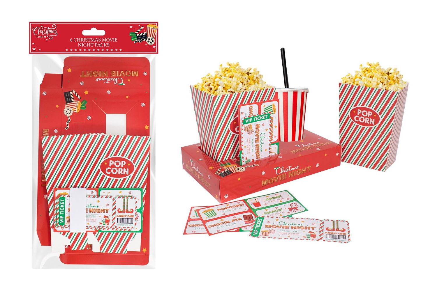 Turn your living room into a festive cinema with this Christmas Movie Night Set! Each pack includes six sets with striped popcorn boxes, VIP tickets, and themed treat labels - everything you need to create the perfect holiday movie marathon.