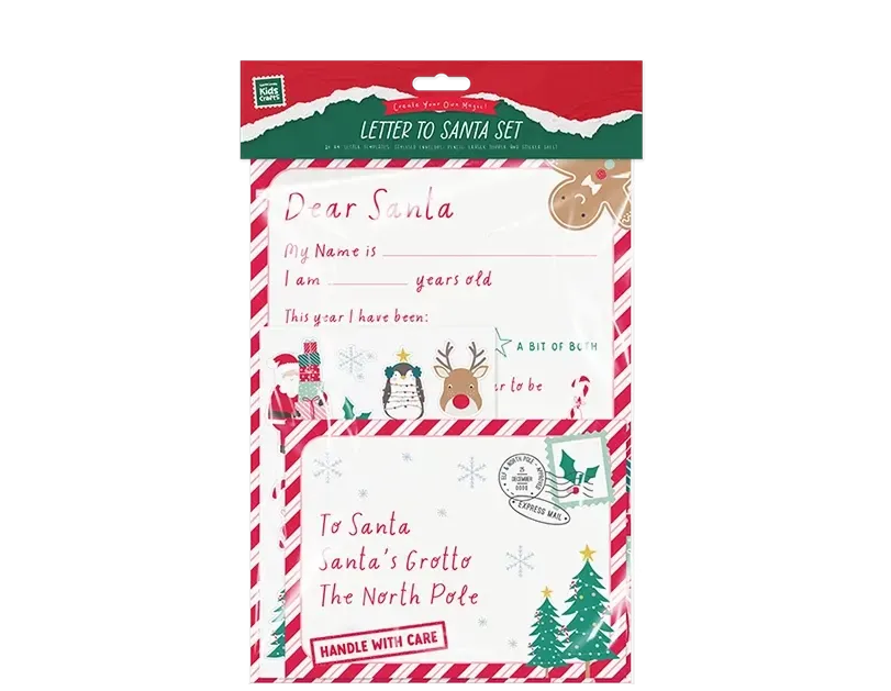 Delight your child's imagination with our Festive Letter to Santa Kit. This enchanting pack includes everything your little one needs to write their heartfelt wishes to Santa Claus. Inside, you'll find beautifully designed letter paper adorned with whimsical holiday illustrations and cheerful motifs, along with a stylised envelope, a pencil, an eraser topper and a sticker sheet.