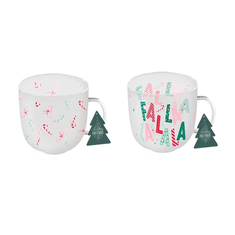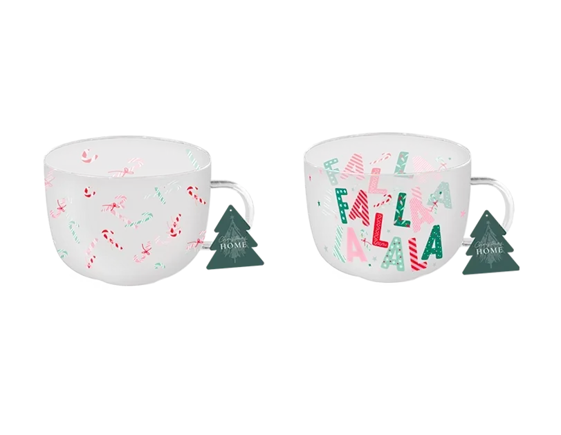 The Christmas Festive Print Glass Mug is crafted from clear glass and measures approximately 8.5 cm tall, making it perfectly sized for hot chocolate and or other warming treats. Each mug comes decorated in one of two whimsical Christmassy designs - think candy canes or cheerful “Fa-la-la-la” prints - and arrives as a surprise, with one design chosen at random. Please note, these festive beauties are hand-wash only and not suitable for microwaves or dishwashers