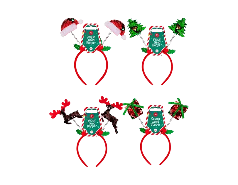 The Reversible Sequin Christmas Head Boppers bring festive flair with a playful twist, each fabric-covered plastic headband features two spring-mounted boppers topped with reversible sequins that change colour with a swipe of your finger.