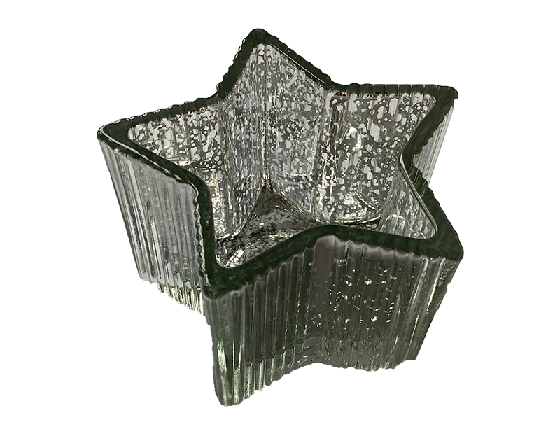 Bring a touch of sparkle to your home with this Star-Shaped Glass Candle Holder. Its textured glass and delicate silver speckled finish beautifully reflect candlelight, creating a warm and inviting glow.