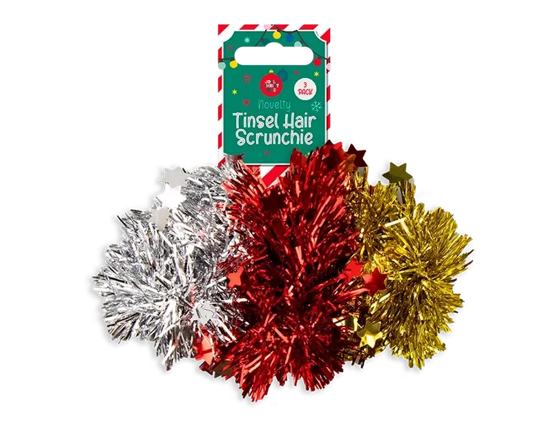 Add a touch of sparkle to your hairdo with our Pack of 3 Sparkling Tinsel Hair Scrunchies. Perfect for any occasion, these scrunchies are crafted with high-quality, shimmering tinsel that catches the light beautifully, creating an eye-catching effect.