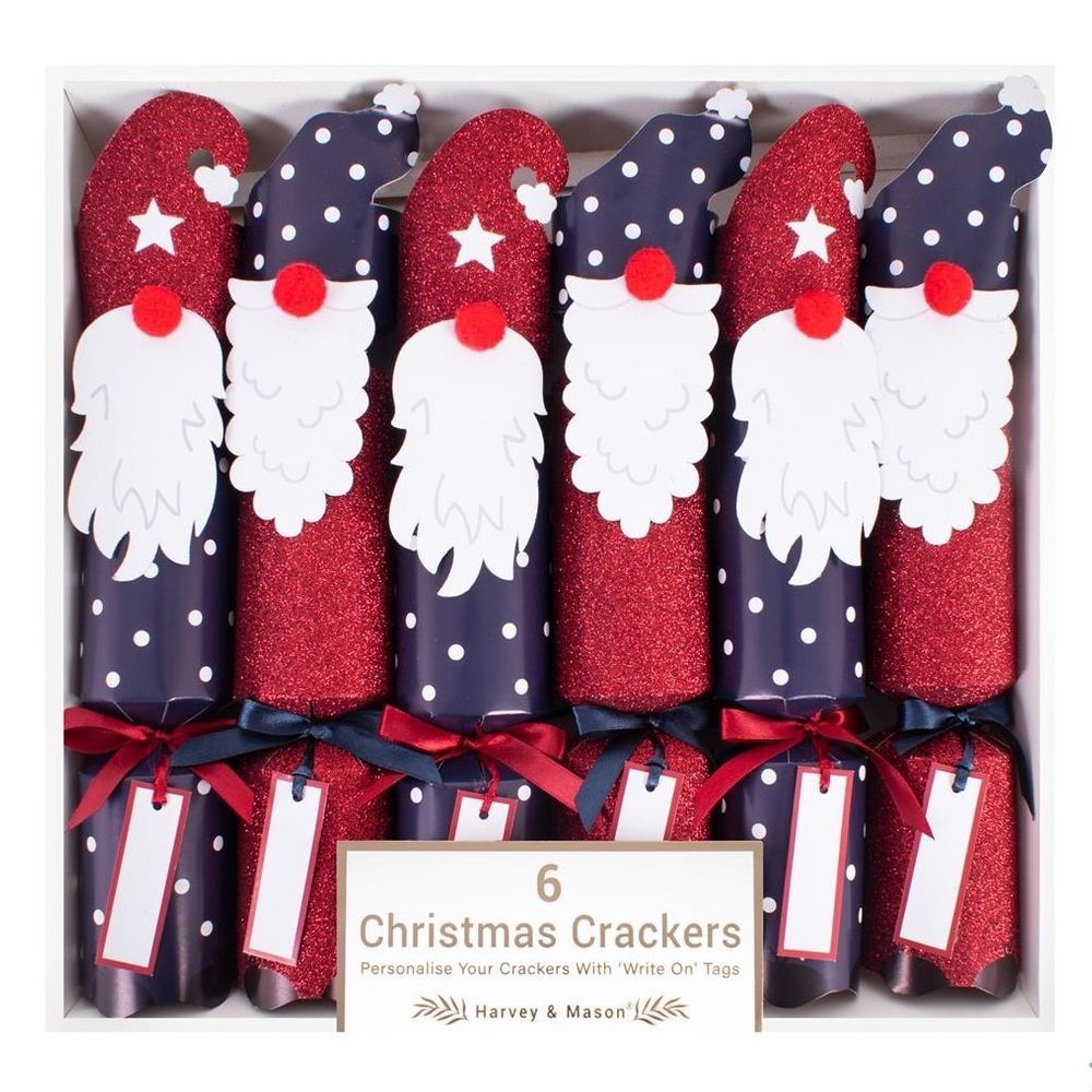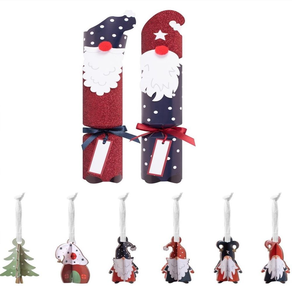 This pack of six crackers is a fun and engaging item for christmas, featuring a novelty gonk character printed on a gliiter red base or midnight blue base and finished with a red or blue ribbon. These crackers contain a hat, snap, motto and gift.