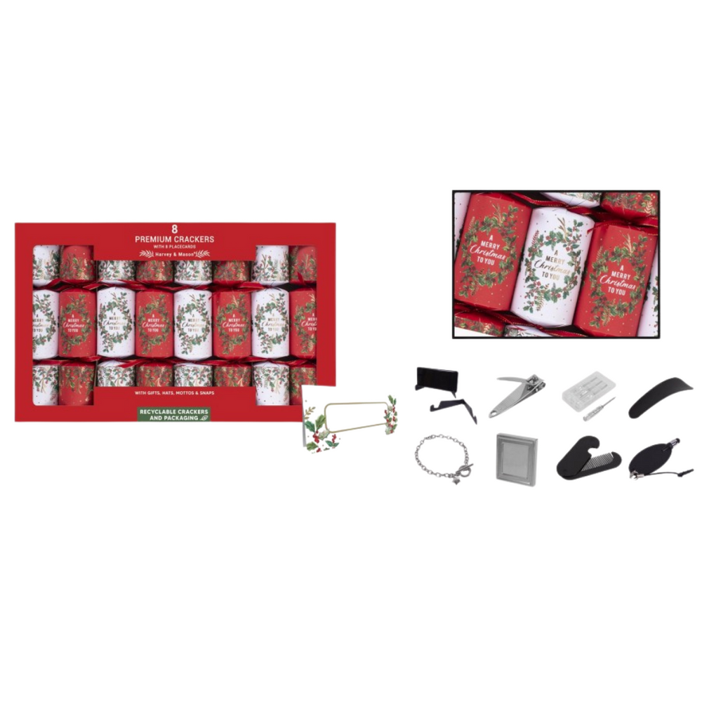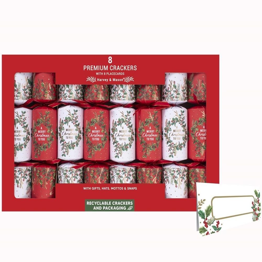 These premium crackers will add a contemporary elegance to your table, complete with matching place cards. A striking wreath design on a red background and finished with a red ribbon.
