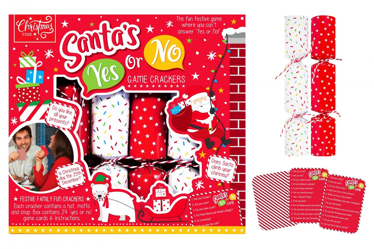 This pack of 6 Santa 'yes or no' game crackers with a confetti design. Includes 24 'yes or no' game cards and instructions.