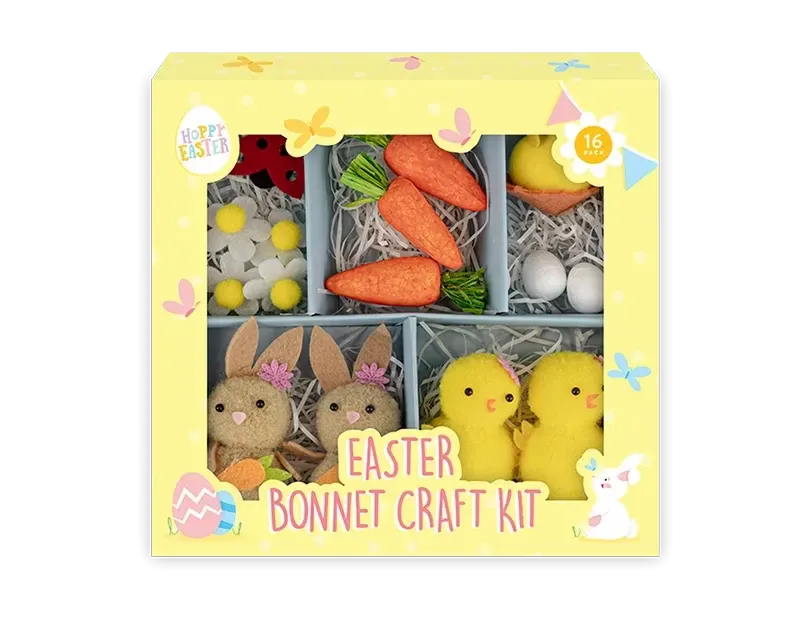 Get ready for creative fun this Easter with the Easter Bonnet Craft Kit! Perfect for decorating Easter bonnets, cards, or other festive craft projects, this kit includes 16 delightful pieces to spark your imagination. Inside, you’ll find 2 pompom bunnies with felt trims, 2 pompom chicks with felt trims, 3 polystyrene carrots with paper stems, 1 polystyrene flocked chick in a felt nest, 2 polystyrene eggs, 5 felt daisies with pompom centers, and 1 adorable felt ladybird. Ideal for crafting sessions with kids or adults, this kit makes it easy to create charming, one-of-a-kind Easter decorations everyone will love!