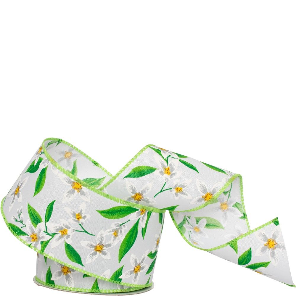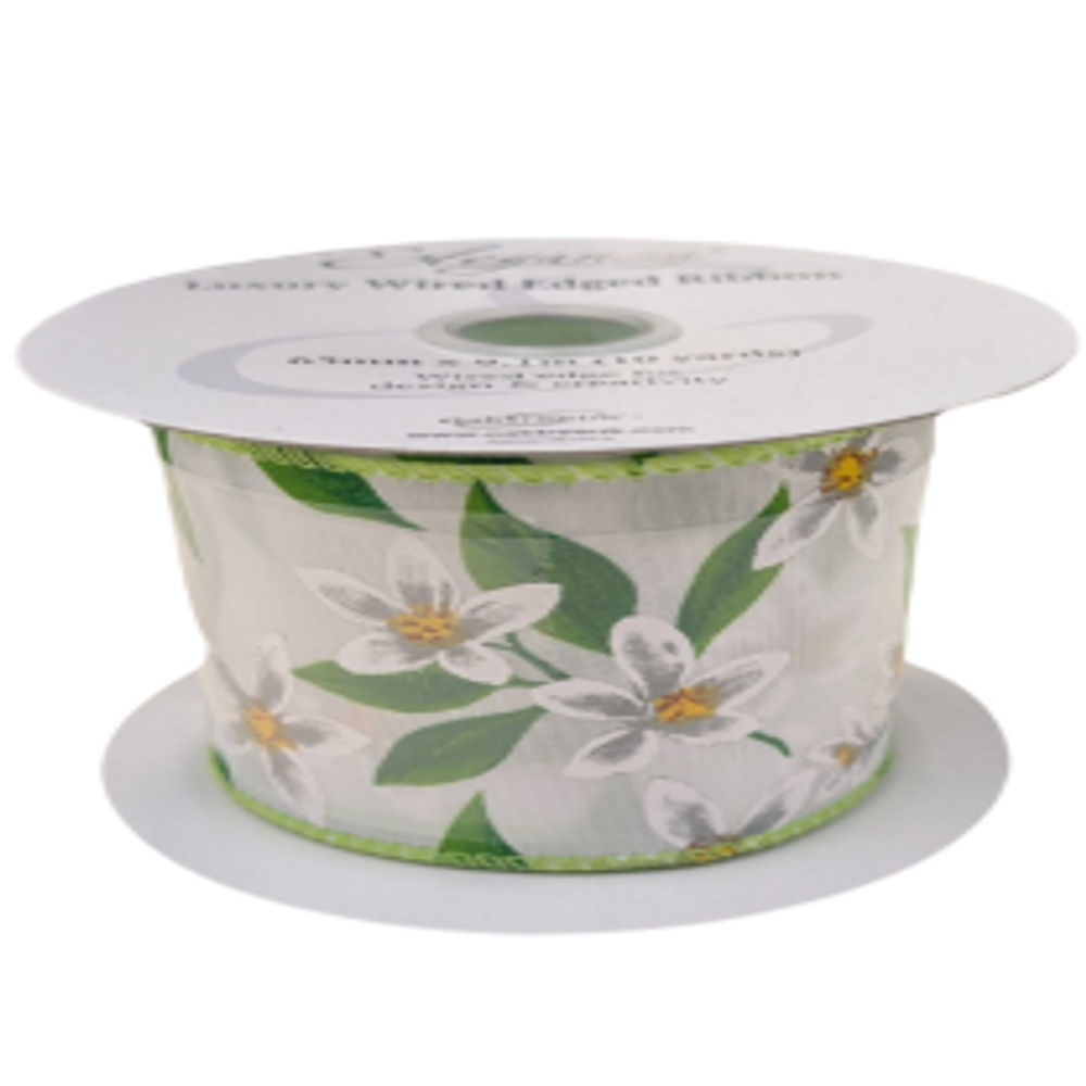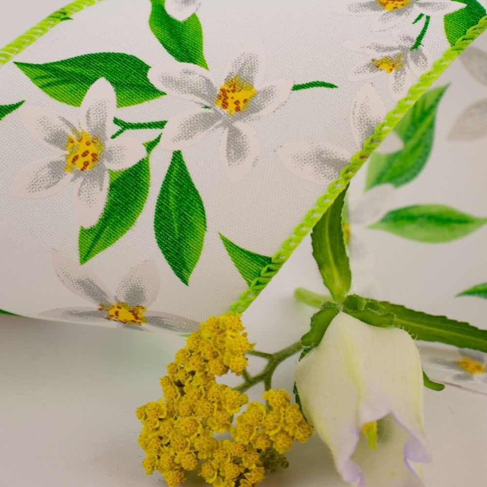 Featuring elegant yellow centered white flowers and green leaves on a white hessian-style fabric, this ribbon offers a fresh, natural touch to any project. The wired edges ensure it holds its shape, making it perfect for floral arrangements, spring decor, gift wrapping, and crafting. Add a touch of elegance and nature’s charm to your creations with this versatile and beautiful ribbon.