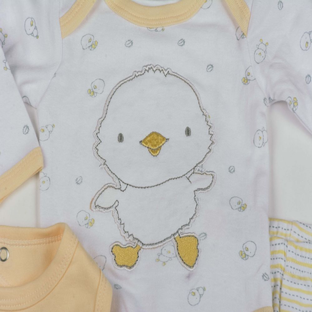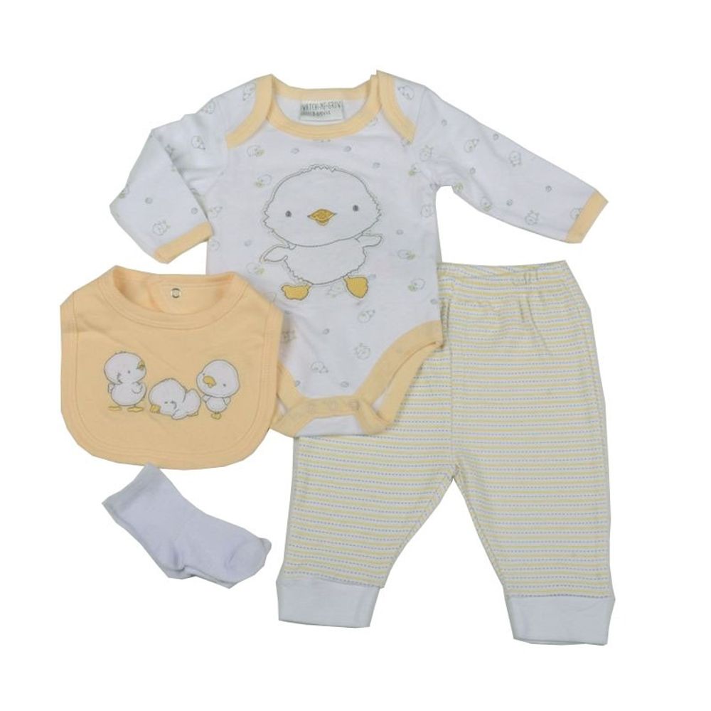 Four piece set perfect as a gift for newborn babies. Set includes trousers, long sleeve vest, socks and bib all in white and beige with Chick design.