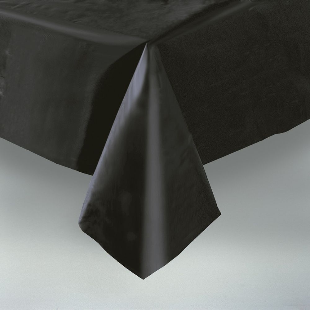 Decorate and protect your party table with this plastic black tablecover.