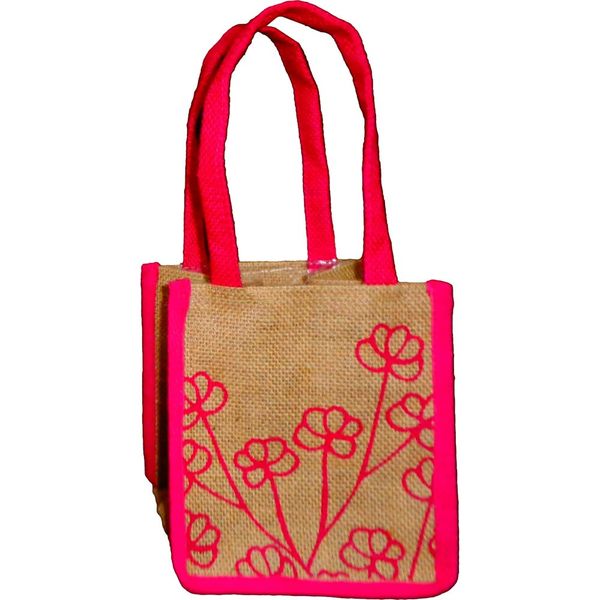 Natural coloured jute plant bag featuring a modern, simple line drawing of flowers and stems in hot pink.