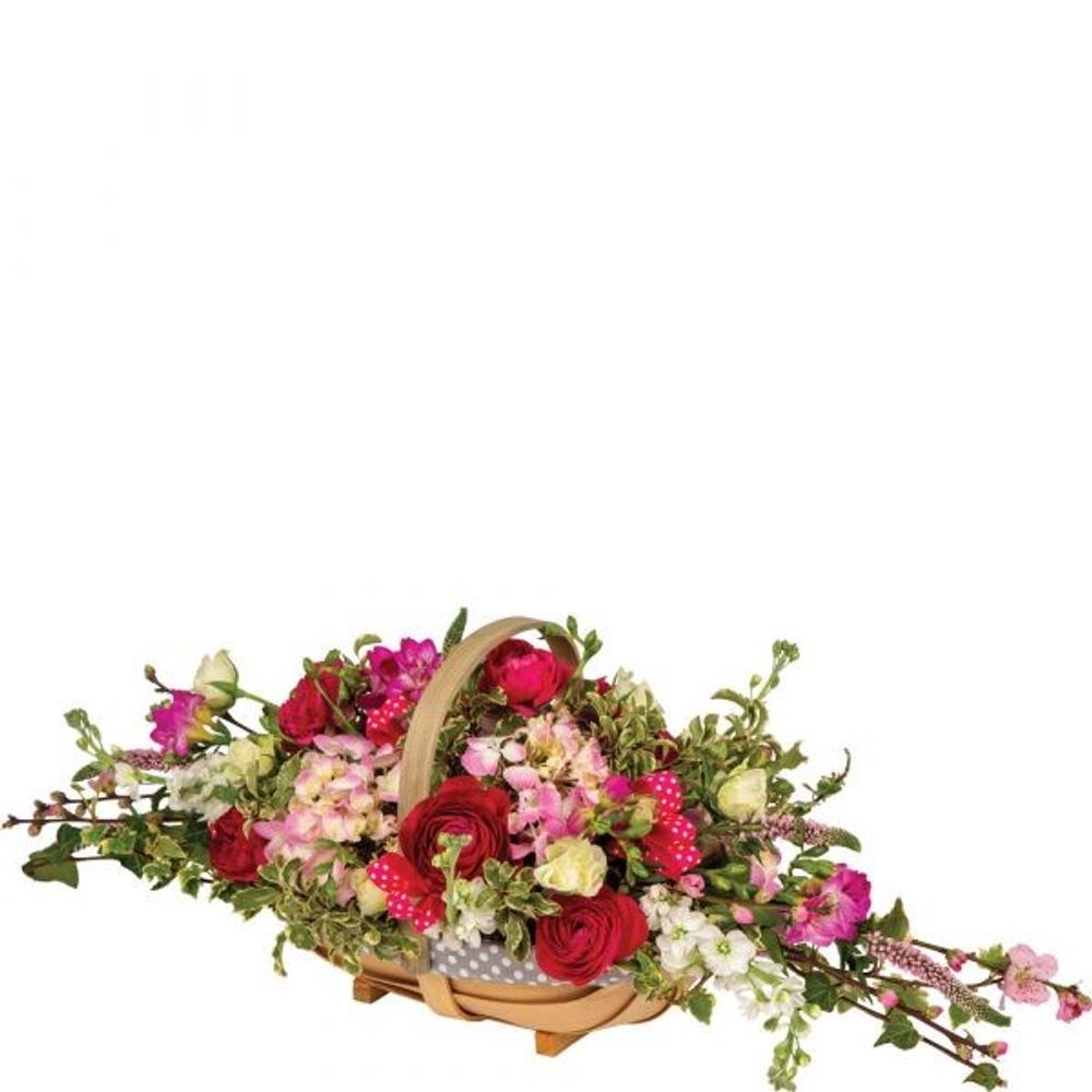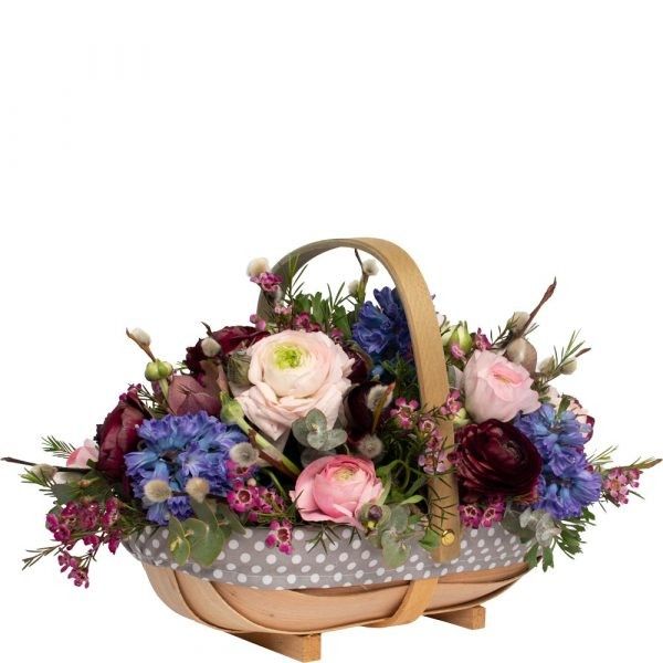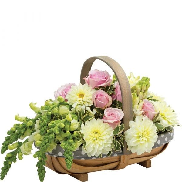 Natural colour softwood trug trimmed with soft grey polka dot material & finished with matching hinged handle; plastic lined